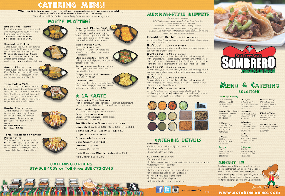 If you're in the mood for a flavorful and authentic Mexican meal, the Sombrero Mexican Food Menu has everything you could want and more. Located at 12346 Woodside Ave, Lakeside, CA, this spot is perfect for anyone craving fresh, satisfying dishes made from the finest ingredients. From sizzling fajitas to perfectly seasoned tacos, the menu is packed with vibrant flavors that transport you straight to Mexico. You can’t go wrong with their famous burritos, whether you prefer them loaded with carnitas, steak, or shrimp. And don’t forget to try their mouth-watering enchiladas, smothered in rich, tangy sauce. The combination of classic Mexican flavors with a modern twist makes every bite a treat. Whether you're in the mood for something spicy or mild, there's a dish to satisfy every palate. So, whether you're stopping by for a quick bite or sitting down with friends, you're in for a delicious experience at Sombrero Mexican Food.